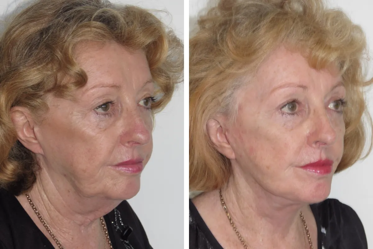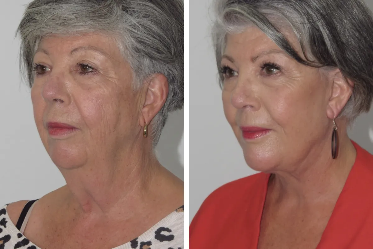Case Details: 65yo. Signs of facial ageing in the face and neck. Also underwent a Deep Plane Facelift + Upper Blepharoplasty/Eyelid Surgery + Submental Liposuction. Results shown at 3 months.